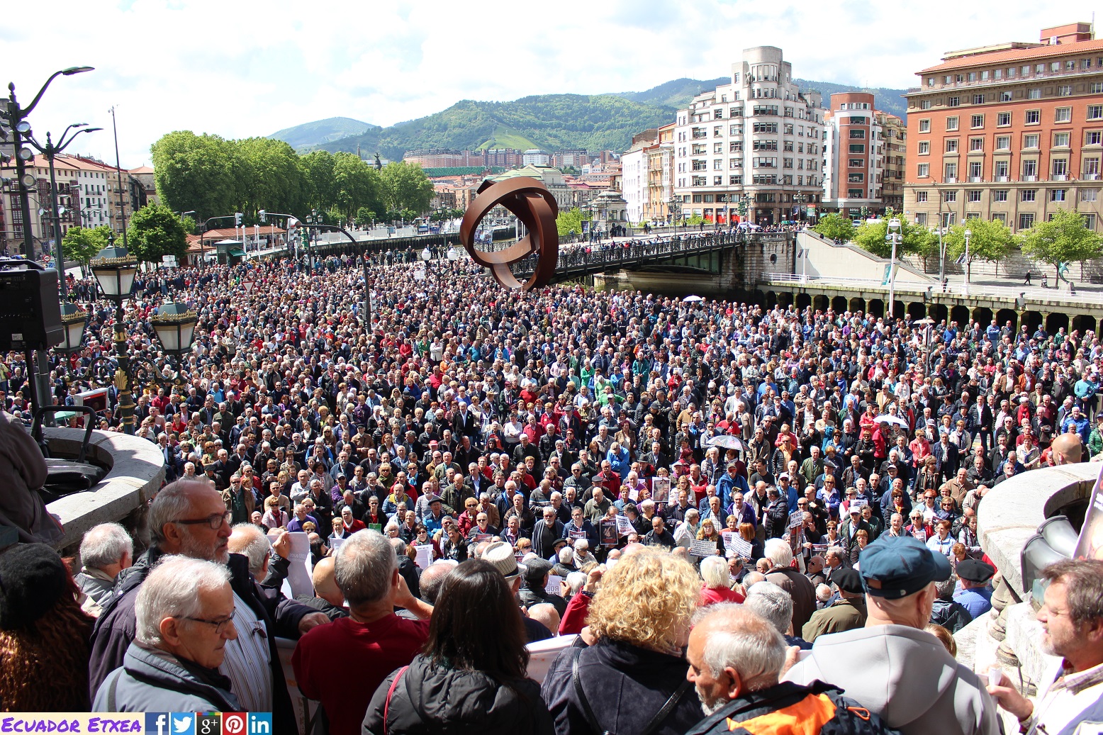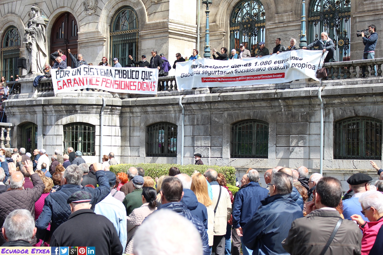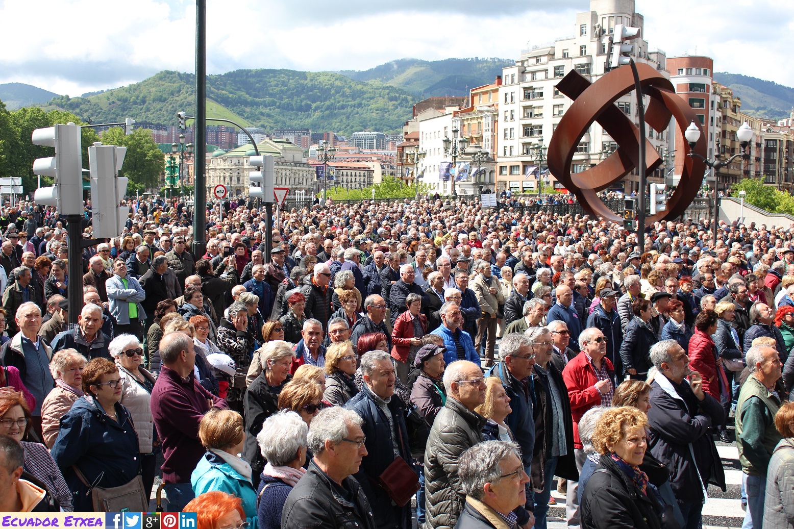 Un lunes más, cientos de personas jubiladas, pensionistas y viudas han realizado una concentración frente al Ayuntamiento de Bilbao, así como en distintos puntos de Bizkaia, Euskal Herria y en estado español, para anunciar e invitar a toda la ciudadanía a acudir a la nueva gran manifestación que se realizará este próximo sábado 26 de mayo en Bilbao y que partirá a las 18:00 horas desde el Sagrado Corazón hasta finalizar en el mismo ayuntamiento.
