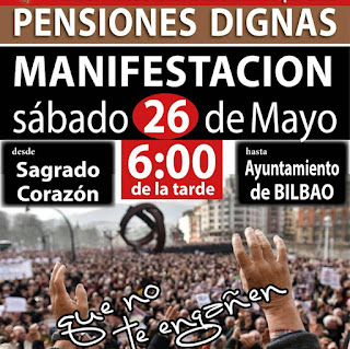 A falta de pocos días para una nueva jornada de movilizaciones masivas que vienen realizando personas jubiladas, pensionistas y viudas en toda Euskal Herria y en el resto del estado español. La Asociación de Personas Jubiladas de Bizkaia (PJB), ha reunido a centenares de pensionistas este lunes 21 mayo, como viene siendo habitual, frente al Ayuntamiento de Bilbao, para anunciar e invitar a toda la ciudadanía a acudir a la nueva gran manifestación por unas pensiones dignas, que se realizará este próximo sábado 26 de mayo en Bilbao y que partirá a las 18:00 horas desde el Sagrado Corazón hasta finalizar en el mismo ayuntamiento.