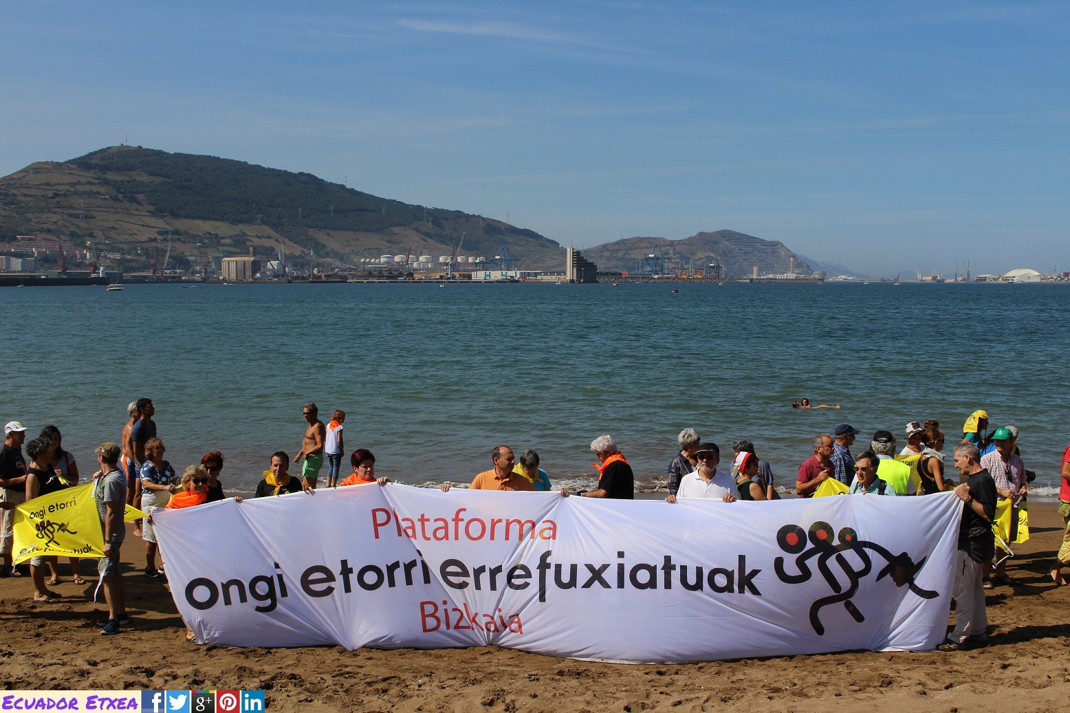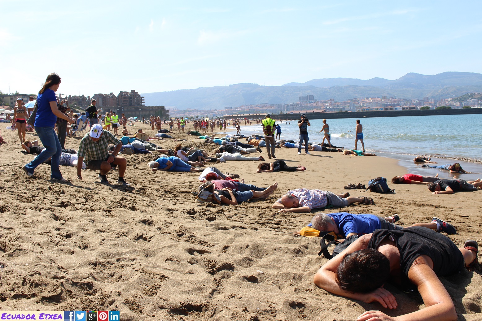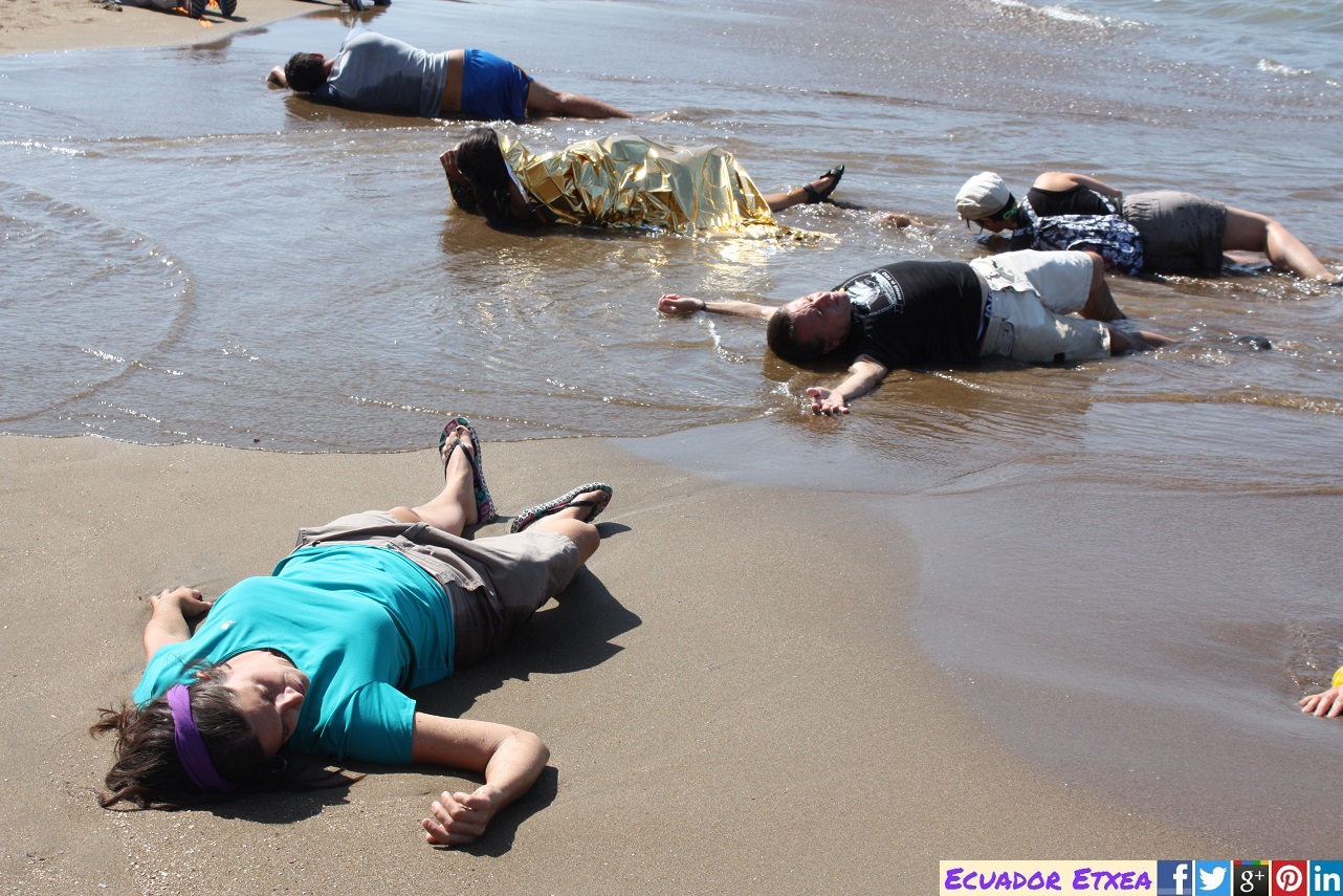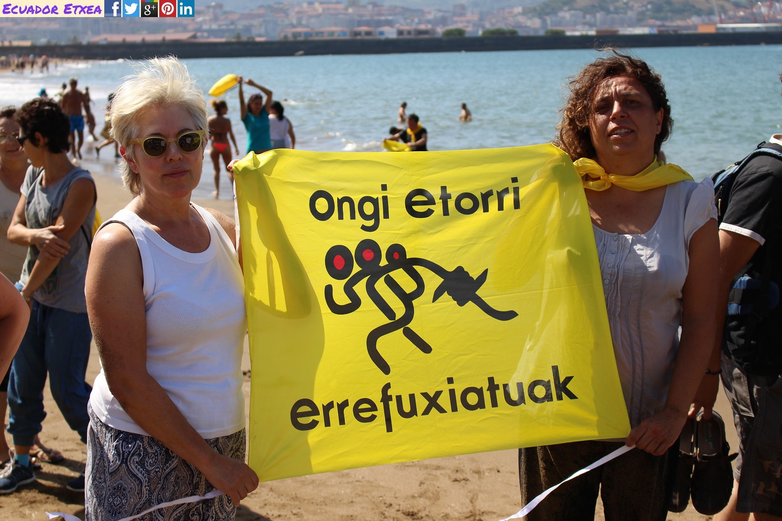 Este sábado 10 de septiembre a las 12:45 hemos realizado una performance en la playa de Ereaga, organizada desde la plataforma Ongi etorri Errefuxiatuak de Getxo y con el apoyo de la red Zurrumurrurik Ez/Antirumores de Getxo. Nos hemos juntado más de 100 personas.