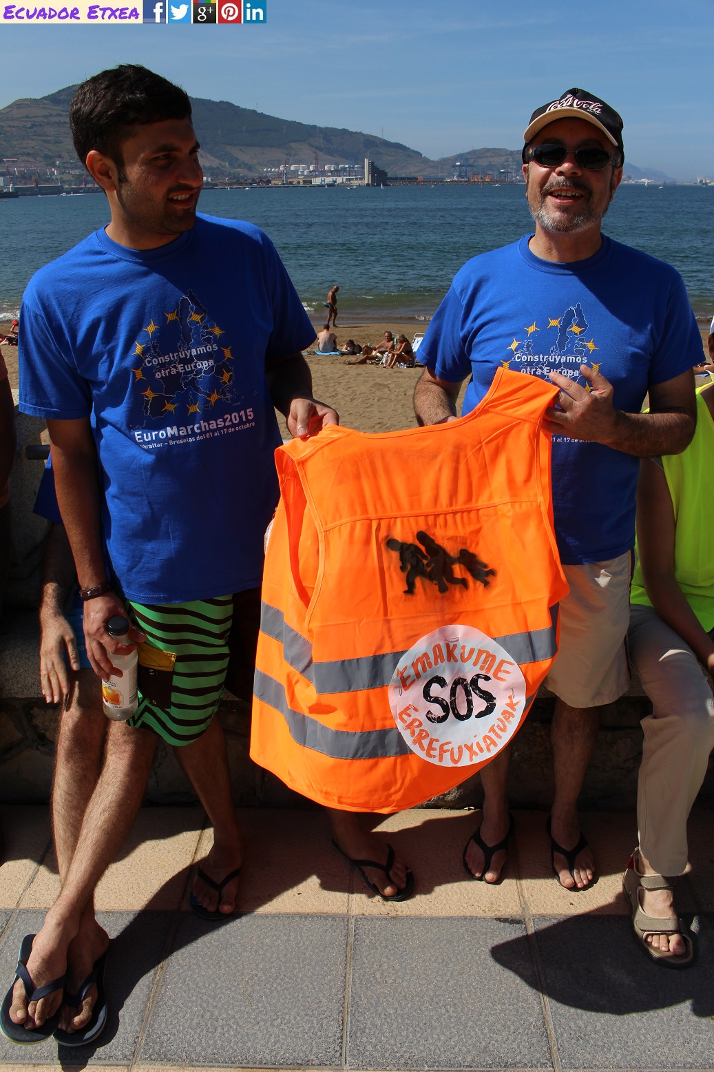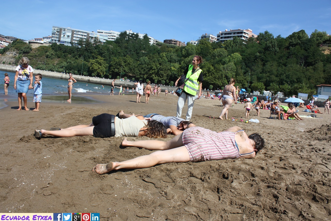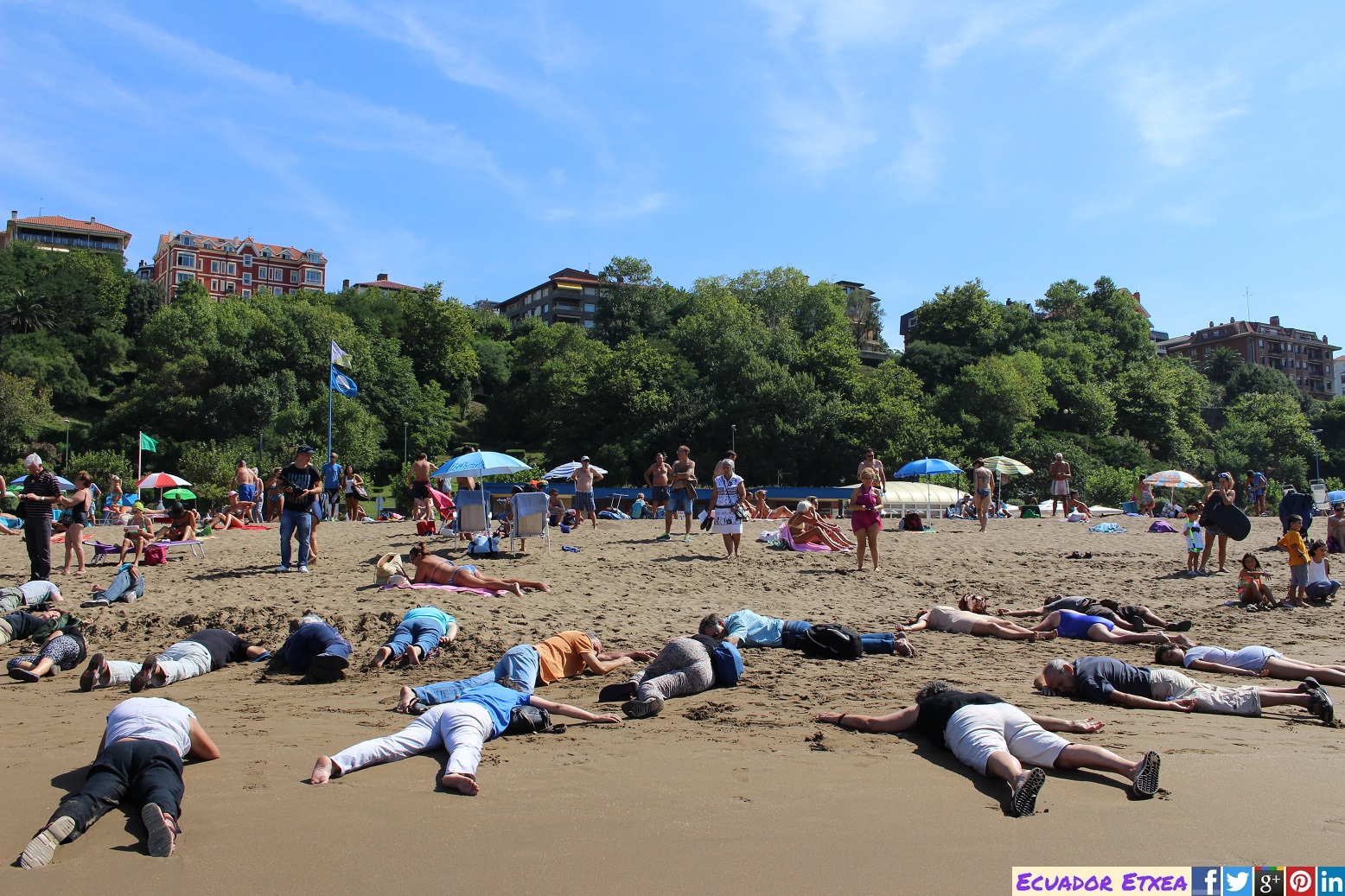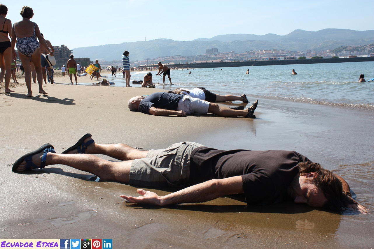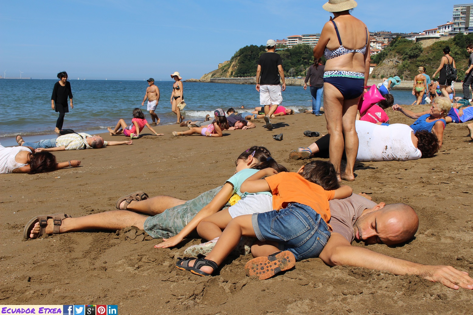Este sábado 10 de septiembre a las 12:45 hemos realizado una performance en la playa de Ereaga, organizada desde la plataforma Ongi etorri Errefuxiatuak de Getxo y con el apoyo de la red Zurrumurrurik Ez/Antirumores de Getxo. Nos hemos juntado más de 100 personas.
