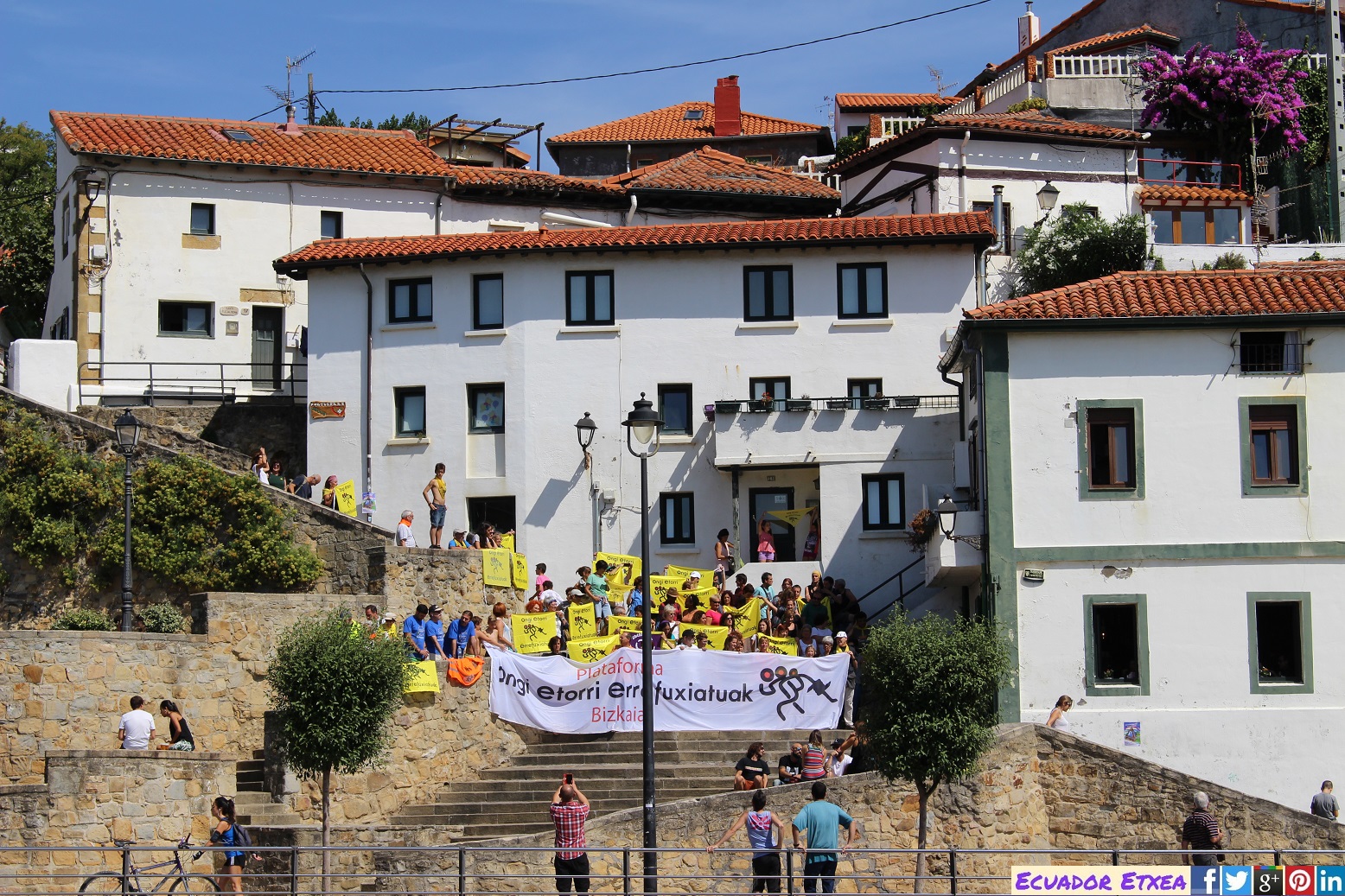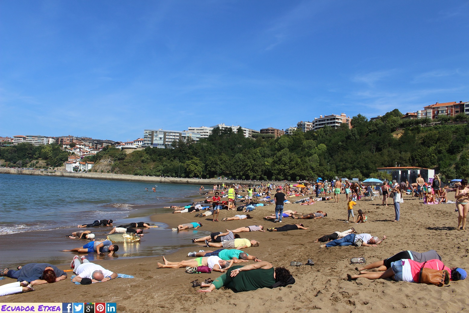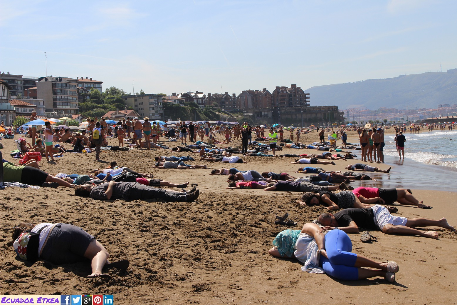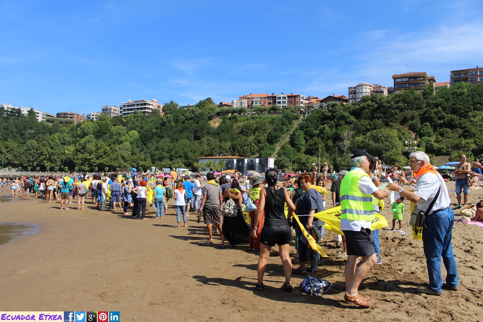 Este sábado 10 de septiembre a las 12:45 hemos realizado una performance en la playa de Ereaga, organizada desde la plataforma Ongi etorri Errefuxiatuak de Getxo y con el apoyo de la red Zurrumurrurik Ez/Antirumores de Getxo. Nos hemos juntado más de 100 personas.
