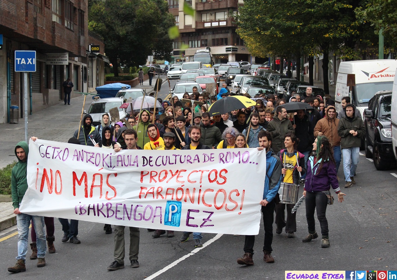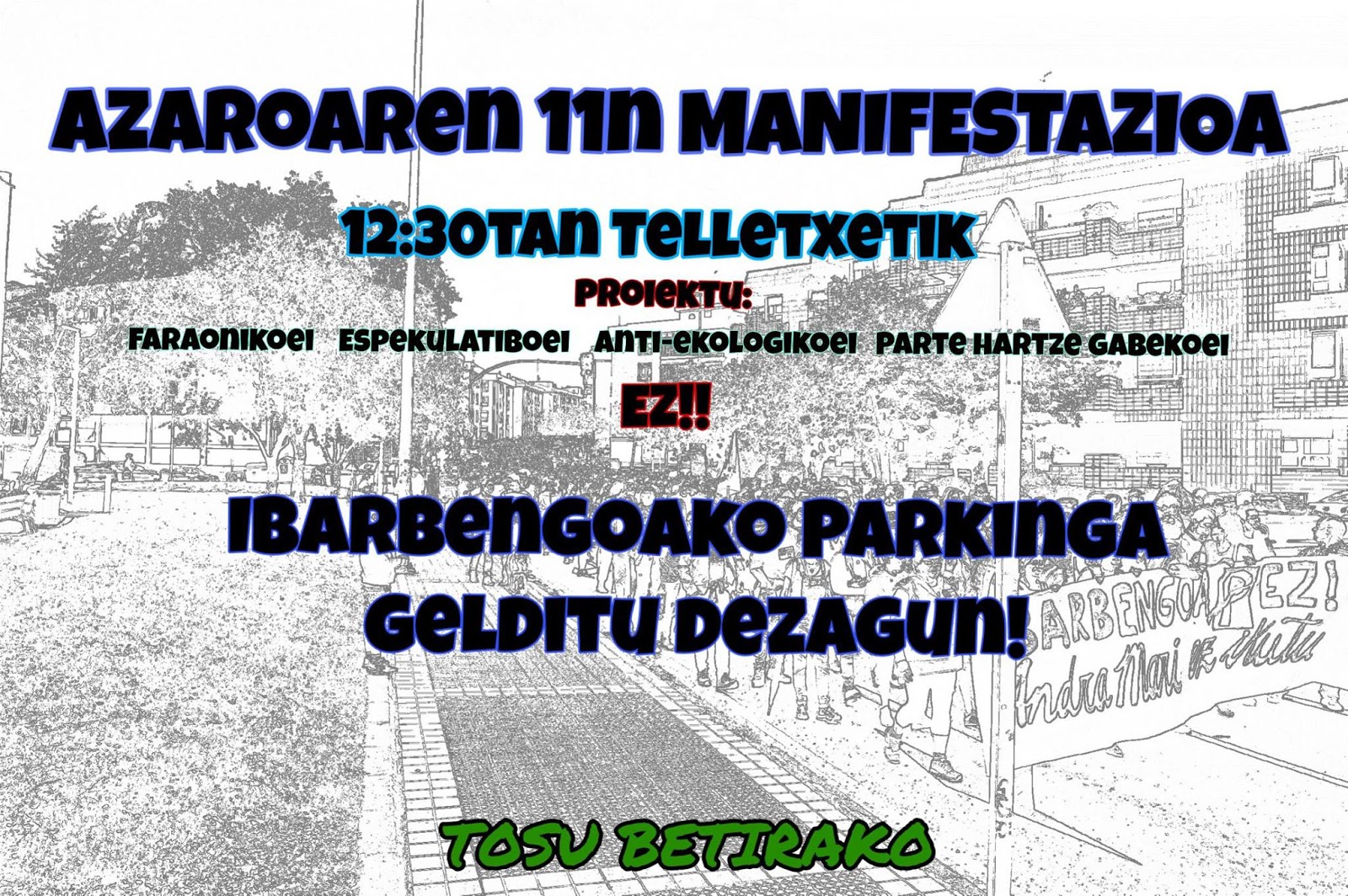 Este sábado 11 de noviembre, Tosu Betirako ha movilizado a cientos de personas que desde varias columnas se han unido en una marcha que arrancó desde la Plaza Telletxe (Algorta) para recorrer el municipio para decir al ayuntamiento que la ciudadanía está en contra del parking de Ibarbengoa. Las obras no han comenzado y no comenzarán, puesto que hay muchas razones contra su construcción. La primera y más palpable es la propia composición de Getxo, con un 80% del suelo urbanizado ¿Hasta cuándo va a ser sostenible construir? Sobre todo cuando en el subsuelo de Tosu se encuentra uno de los acuíferos más importantes de Bizkaia.