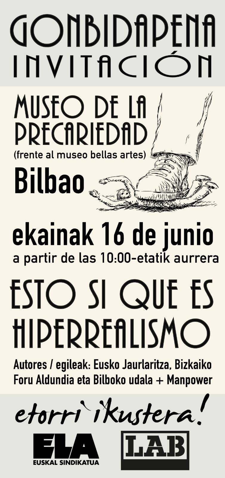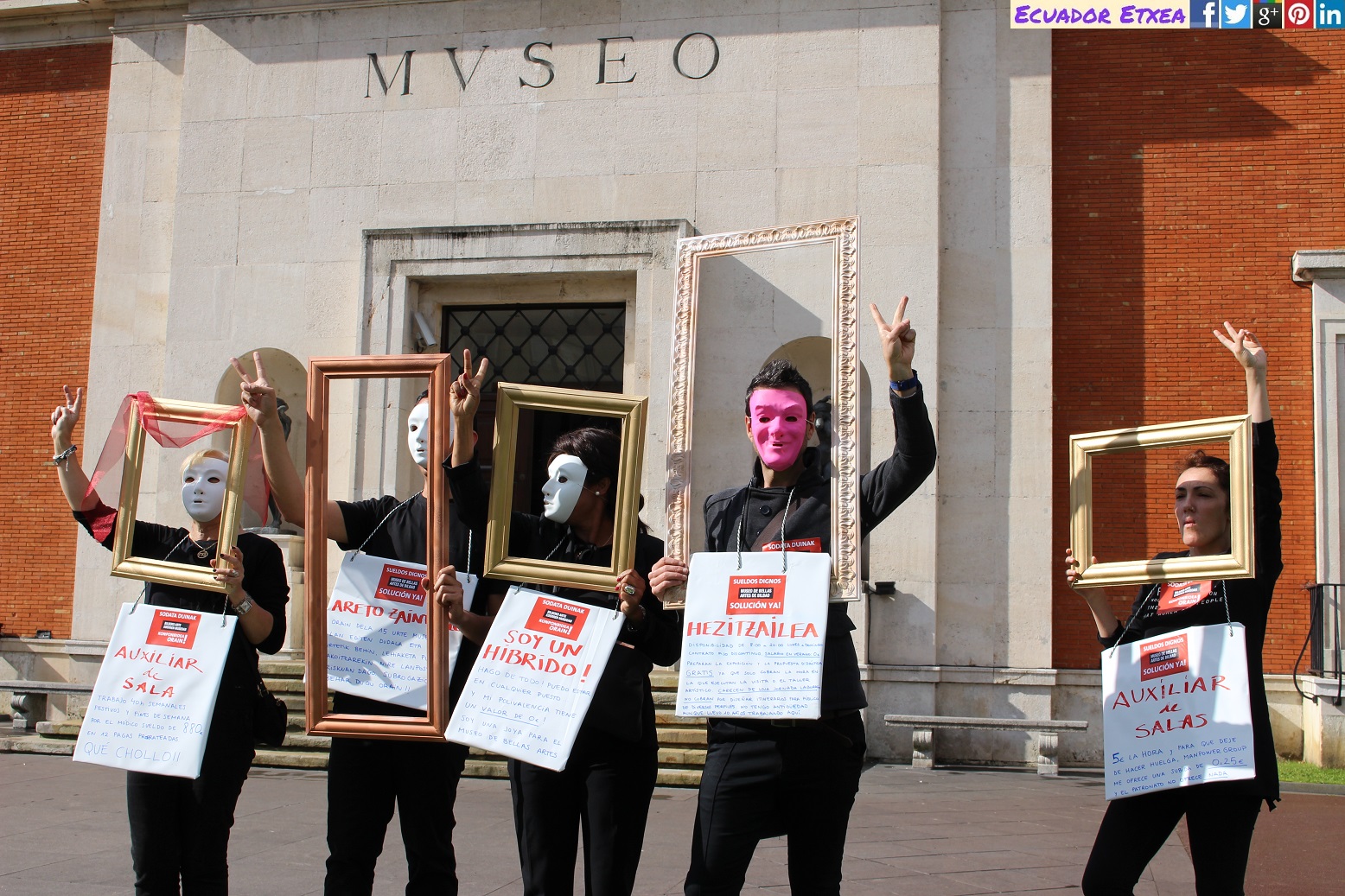 Pedimos que se garanticen unas condiciones justas para las personas sin las cuales el Museo de Bellas Artes de Bilbao no podría llevar a cabo dicha misión. Y que el Patronato del museo presidido por el ayuntamiento de Bilbao, tome las medidas necesarias para recuperar la dignidad laboral de los auxiliares de sala, los educadores, el personal de taquilla, tienda y recepción, y apueste firmemente por la calidad y la defensa del trabajo.