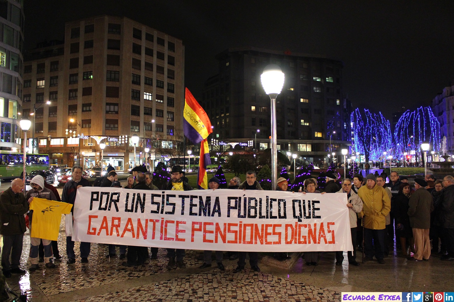 Este Martes 20 de Diciembre a las 19,00 h. en la plaza Moyua de Bilbao (frente a la subdelegación del Gobierno Estatal), se realizó una CONCENTRACIÓN UNITARIA, atendiendo al llamamiento de la Coordinadora Estatal en Defensa del Sistema Público de Pensiones con el lema: Por un sistema público que garantice pensiones dignas.