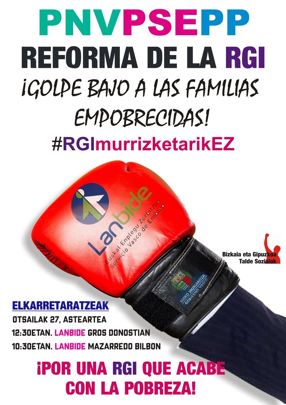 Esta iniciativa surge con el ánimo de exigir que la actual reforma de la RGI conlleve la elaboración de una nueva ley que luche contra la pobreza; y evite los recortes contemplados por el Gobierno Vasco en su “Documento de bases para la mejora de la RGI”. Recortes que supondrán un aumento de la pobreza.