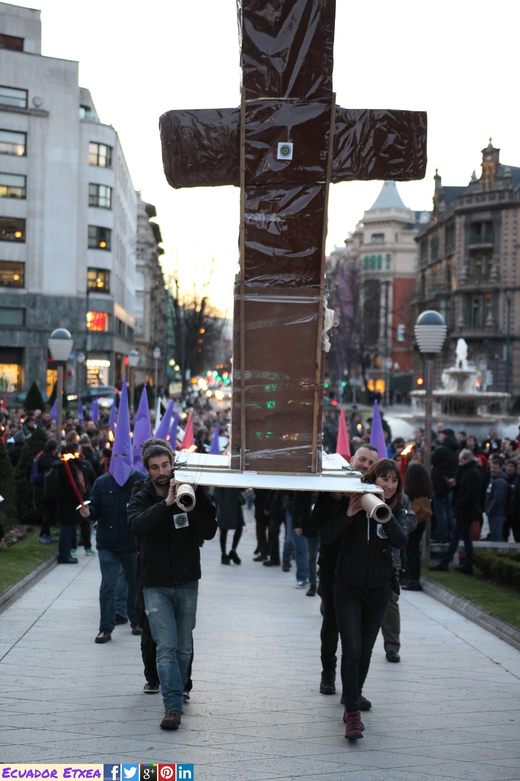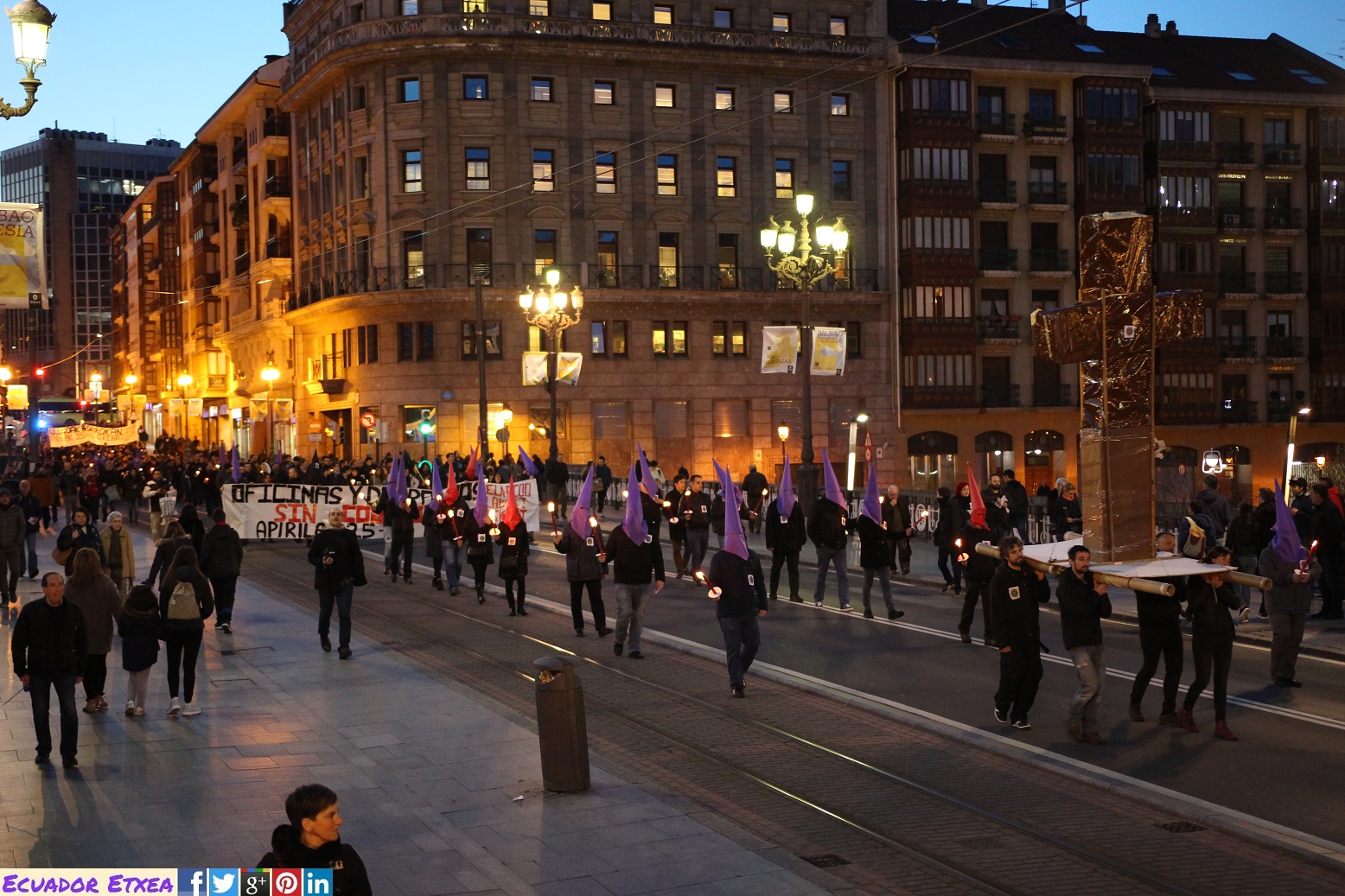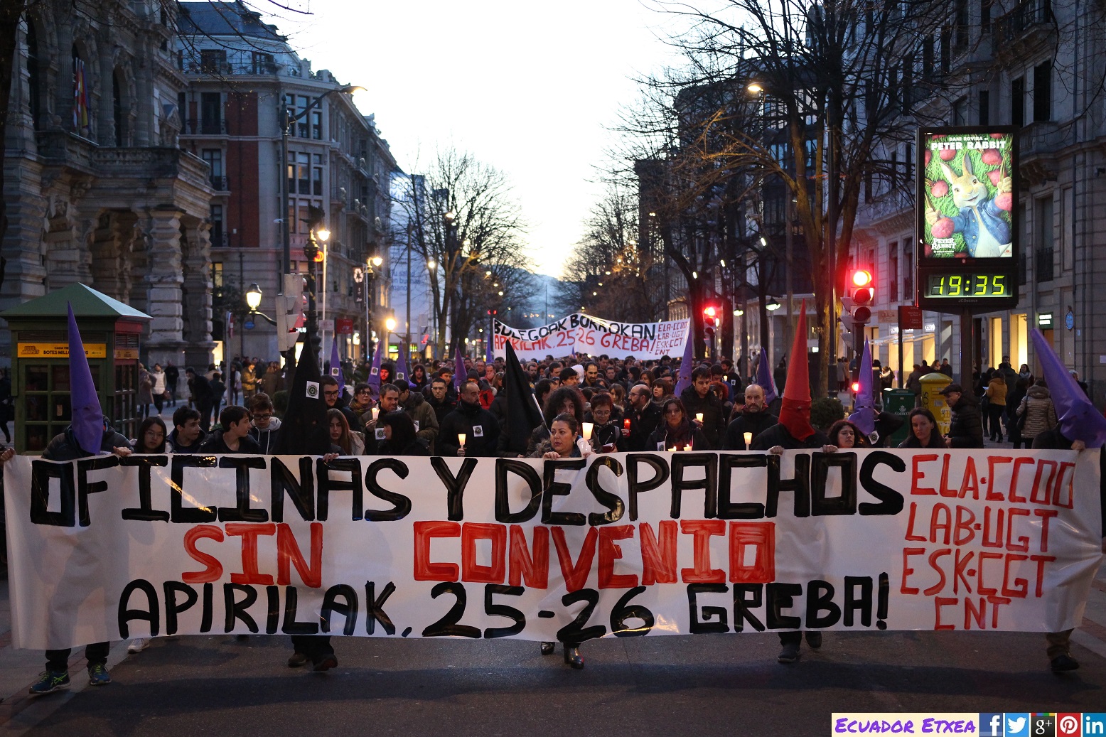Una procesión/manifestación de trabajadoras y trabajadores de Oficinas y Despachos de Bizkaia ha recorrido este jueves 22 de marzo, las calles de Bilbao desde la Plaza Moyua hasta el Teatro Arriaga, apoyada por los sindicatos ELA, LAB, ESK, CGT-LKN, CNT, CCOO y UGT, con el objetivo de conseguir un convenio colectivo sin recortes en las condiciones laborales que afecta a más de 23.000 trabajadoras y trabajadores del sector.