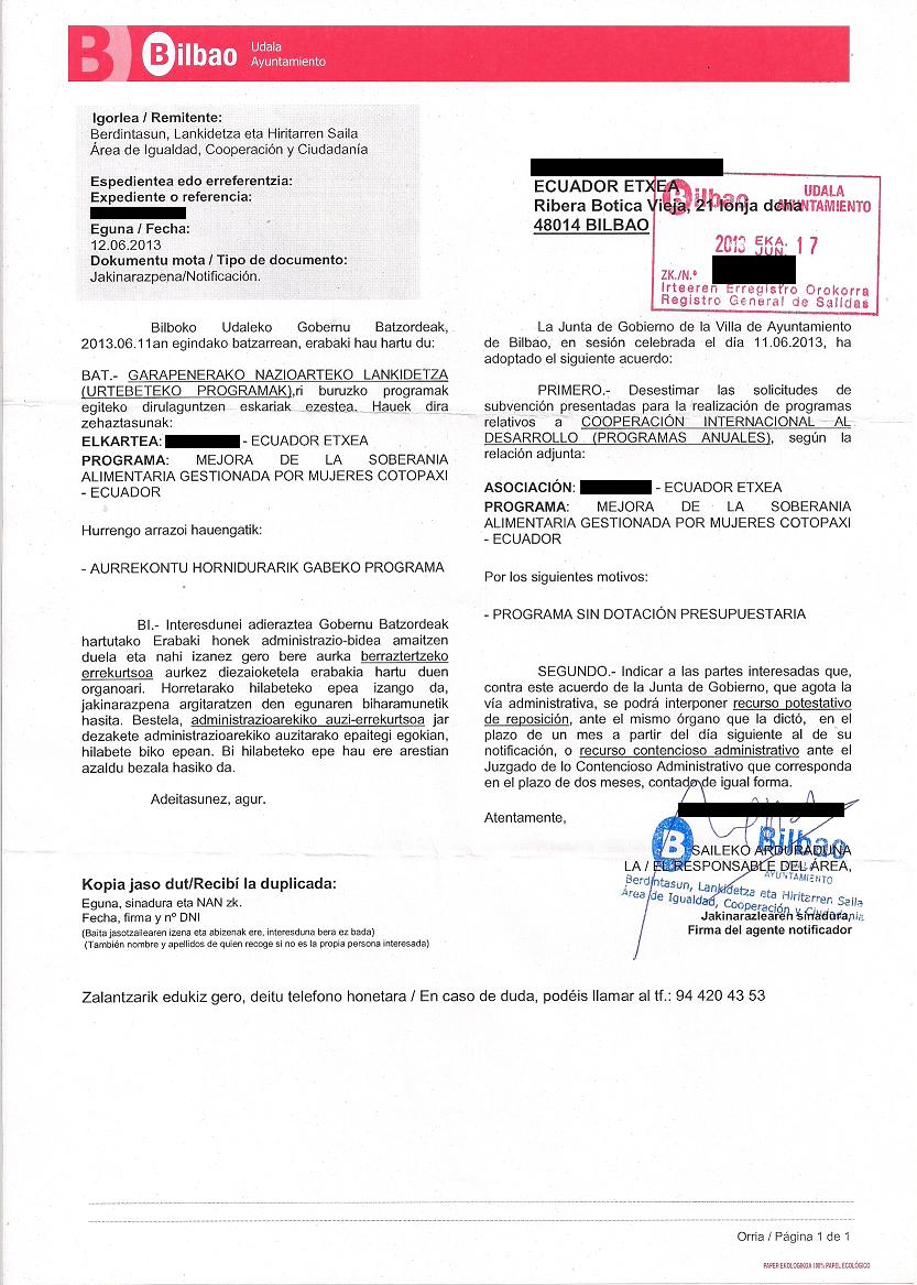 Nombre del Proyecto: Soberanía Alimentaria, mujeres y consumo responsable como estrategias productivas de los gobiernos comunitarios del territorio Kayambi, Diputación Foral de Bizkaia (Título I).