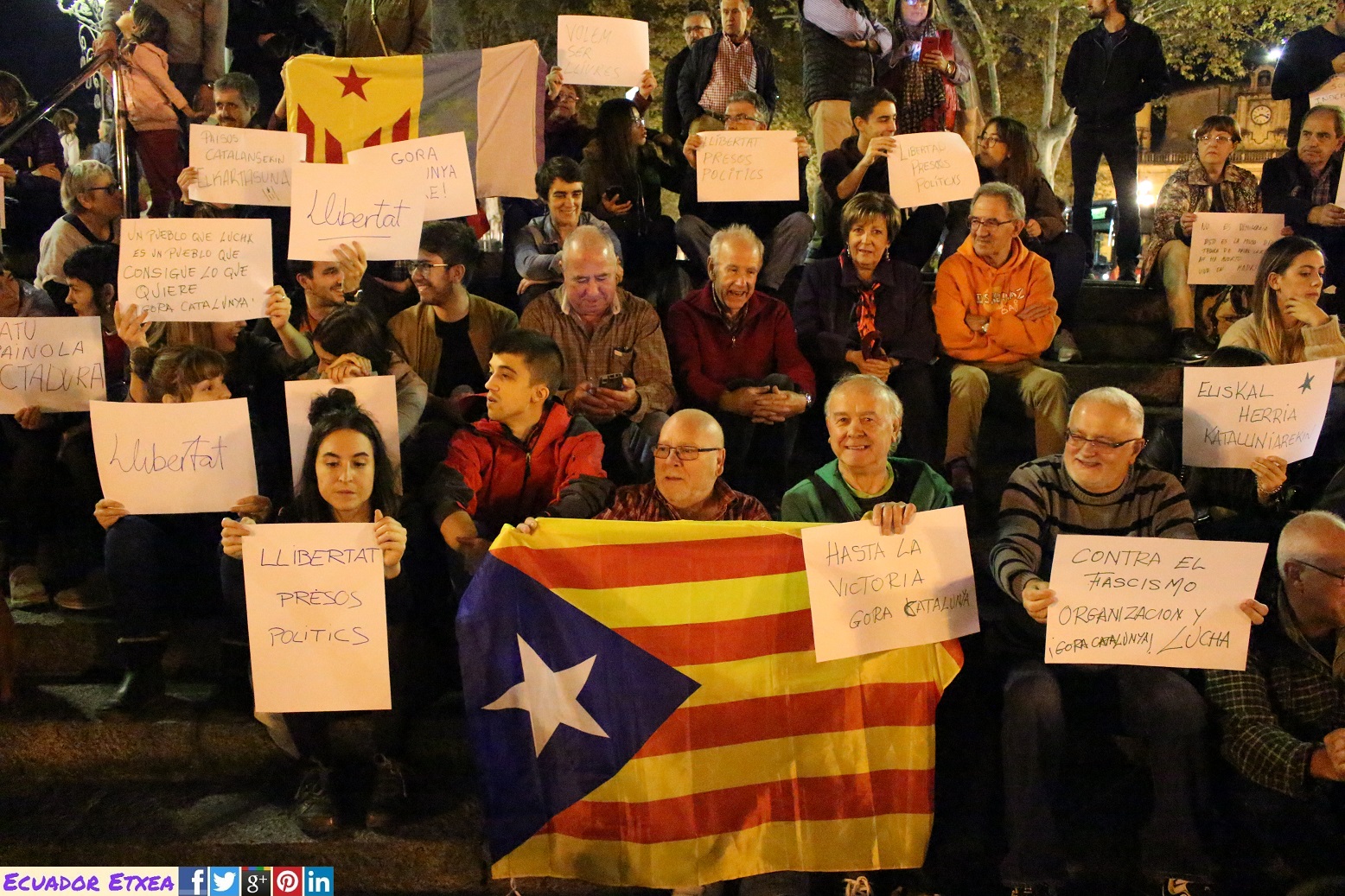 “Apalean y tratan de impedir votar a quien quiere votar para decidir su futuro. Se cargan a un gobierno elegido democráticamente y lo encarcelan por llevar a cabo el programa por el que fueron votados” Centenares de personas de diferentes tradiciones políticas y sociales, preocupadas por la situación de vulneraciones de derechos civiles y políticos cuyo colofón han sido las últimas encarcelaciones de l@s miembros del govern catalán, se han reunido en la céntrica plaza del Teatro Arriaga en Bilbao para que a través de una sentada popular en forma de protesta y una posterior asamblea, se articule una respuesta ciudadana en favor del derecho a decidir y la democracia tras las graves agresiones a Catalunya.