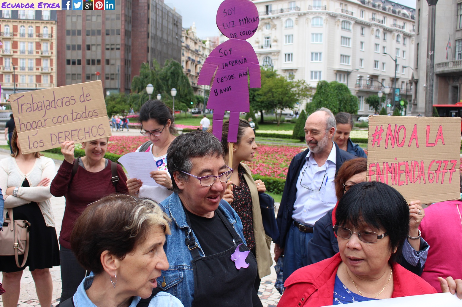Trabajadoras de hogar y de cuidados de Euskal Herria han realizado una concentración en la plaza Moyúa de Bilbao, convocadas por Mujeres del Mundo Babel, Fundación Ellacuría, Torre de Babel y Trabajadoras no domesticadas, a favor del reconocimiento de sus derechos y en contra de la enmienda 6777.