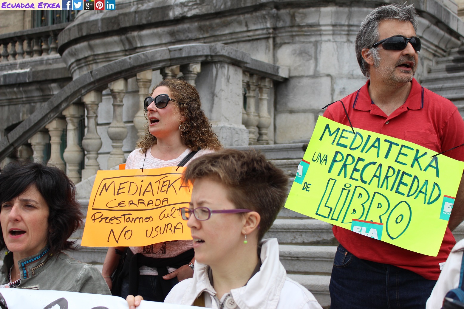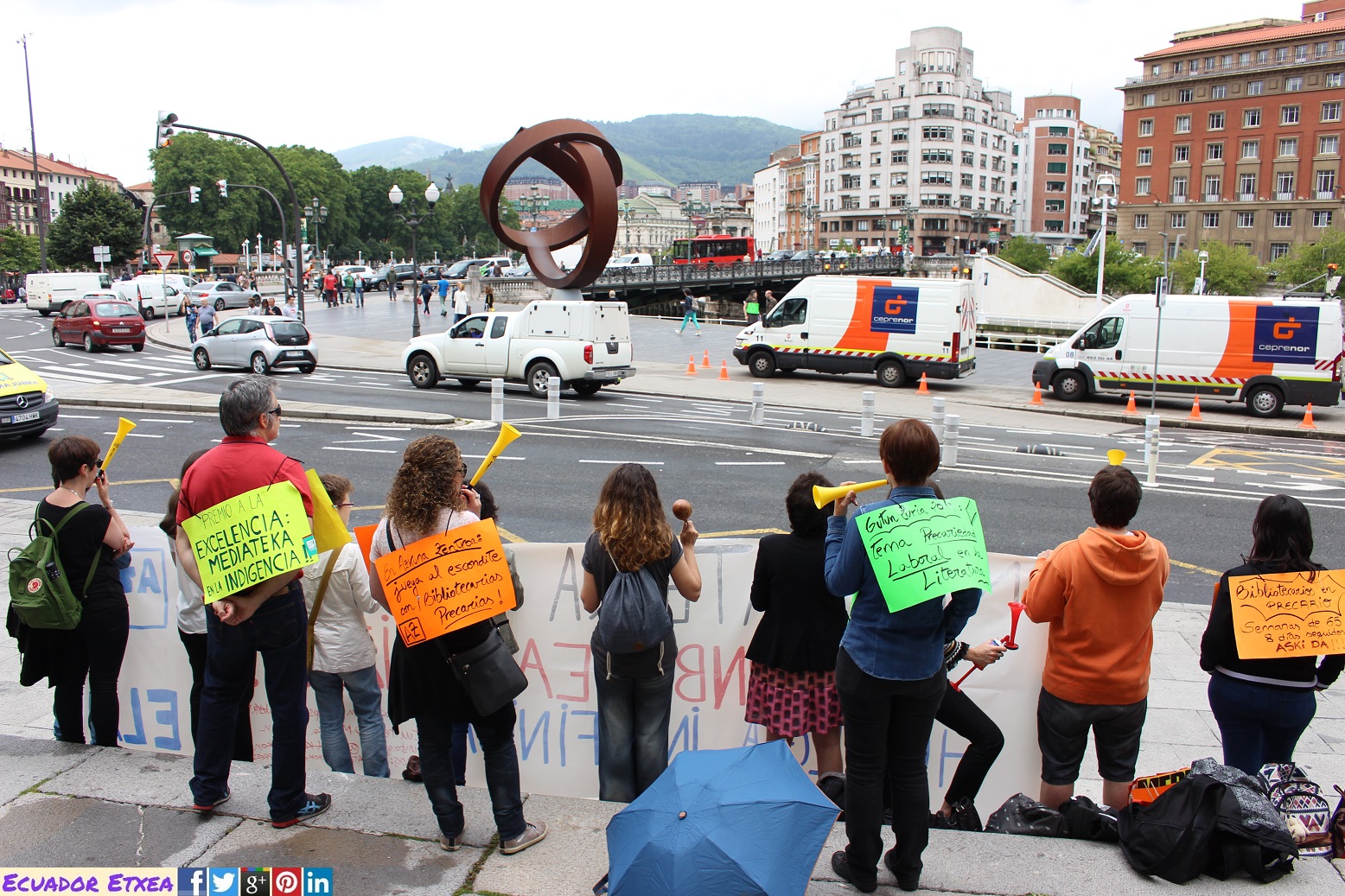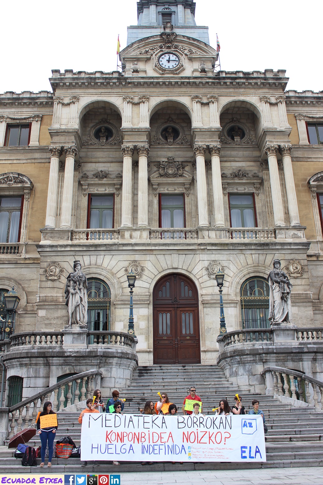 Las trabajadoras de la Mediateka del Azkuna Zentroa (Bilbao) han superado este martes 19 de junio, su vigésimo primer día en huelga indefinida. Y lo han hecho, realizando una concentración ruidosa frente al Ayuntamiento de Bilbao, con el apoyo del sindicato ELA, en donde se ha podido escuchar gritos como “Aburto escucha y saca de la lucha” o “Somos bibliotecarias, no mercenarias”, y lo hacen para denunciar que su plantilla, compuesta por 30 personas, la mayoría mujeres, están atravesando una situación de precariedad laboral desde que el centro se abrió al público hace ya más de 8 años. Denuncian la inestabilidad de sus puestos de trabajo.
