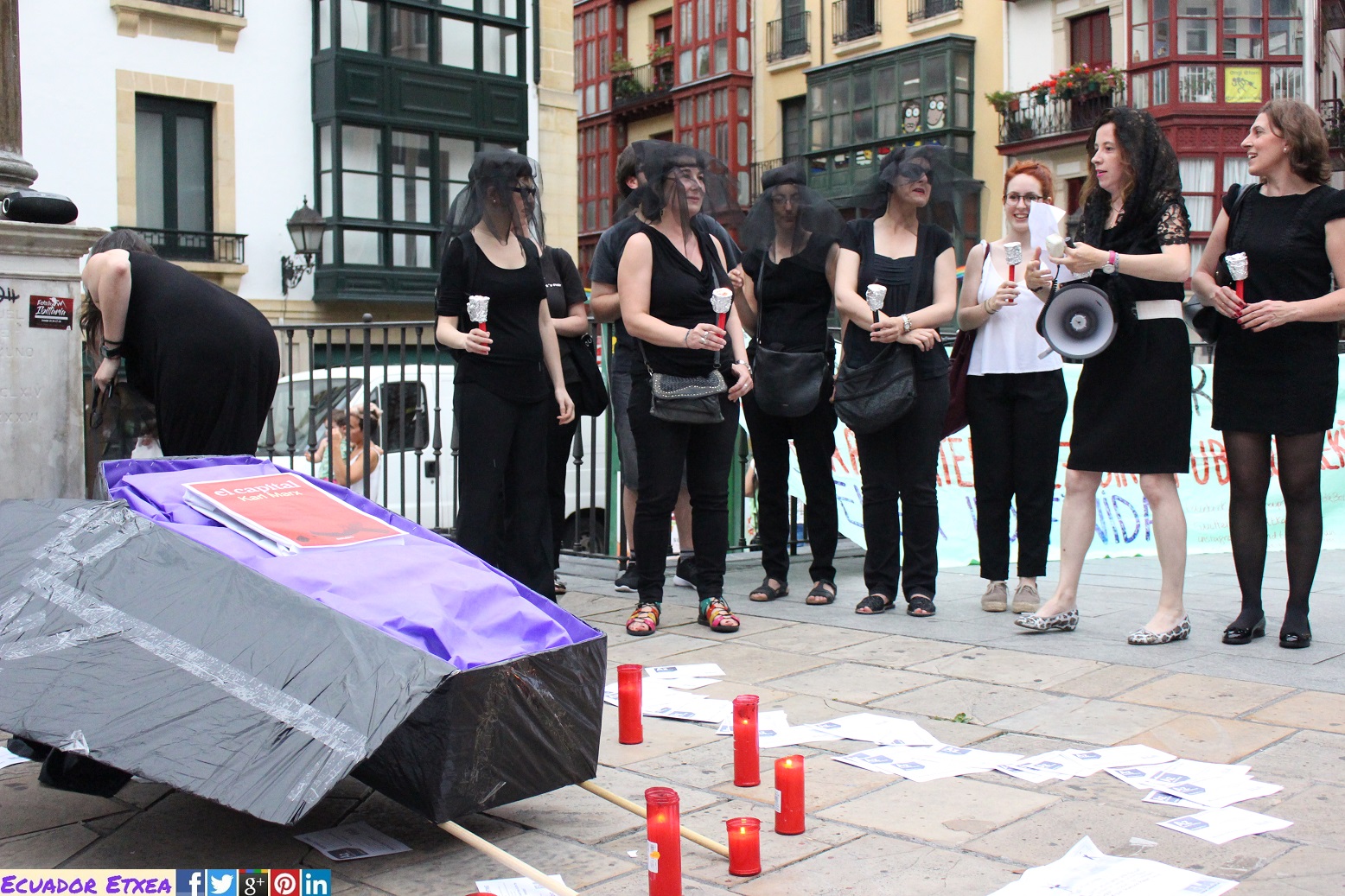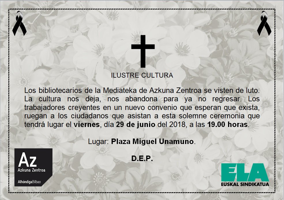Nos encontramos aquí reunidas queridas compañeras, porque nada más podemos hacer por ella, las aquí presentes hemos acompañado a la Cultura hasta sus últimos suspiros, en este Bilbao del trabajo precario, que favorece empresas que subcontratan y que mantienen a sus trabajadoras con contratos hasta fin de obra durante 8 años, sin pago de antigüedad y con sueldos de 650 euros por trabajar fines de semana, sí, sí, que está abierto los 365 días del año, pagando el mismo precio por un miércoles que por el día de Navidad….En este Bilbao de la precariedad, la Cultura muere.
