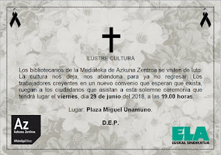Hoy, con el corazón inundado de pena, asistimos a los 31 días de cierre de la Mediateka del Zentro Azkuna, más conocida, como la Biblioteca de la Alhóndiga, 31 días que dicen rápido, pero que van muy despacio si vas viendo como alguien muere poco a poco de precariedad, 31 días que para lo único bueno que ha servido, es para uniros en la defensa de una Cultura que pagamos todos de nuestra bolsillo, pero que bochornosamente, demuestran que en este nuestro Bilbao, una Mediateka que ofrece Cultura y conocimiento puede cerrar 31 días y a ningún representante de nuestro gobierno ni de la Dirección del Zentro Azkuna, se le derrita la cara de vergüenza. Vergüenza, vergüenza, que sí ha hecho mella en nuestra Cultura y que la ha matado, por precariedad. Tanta gloria lleves, como paz dejes. Agur betirako