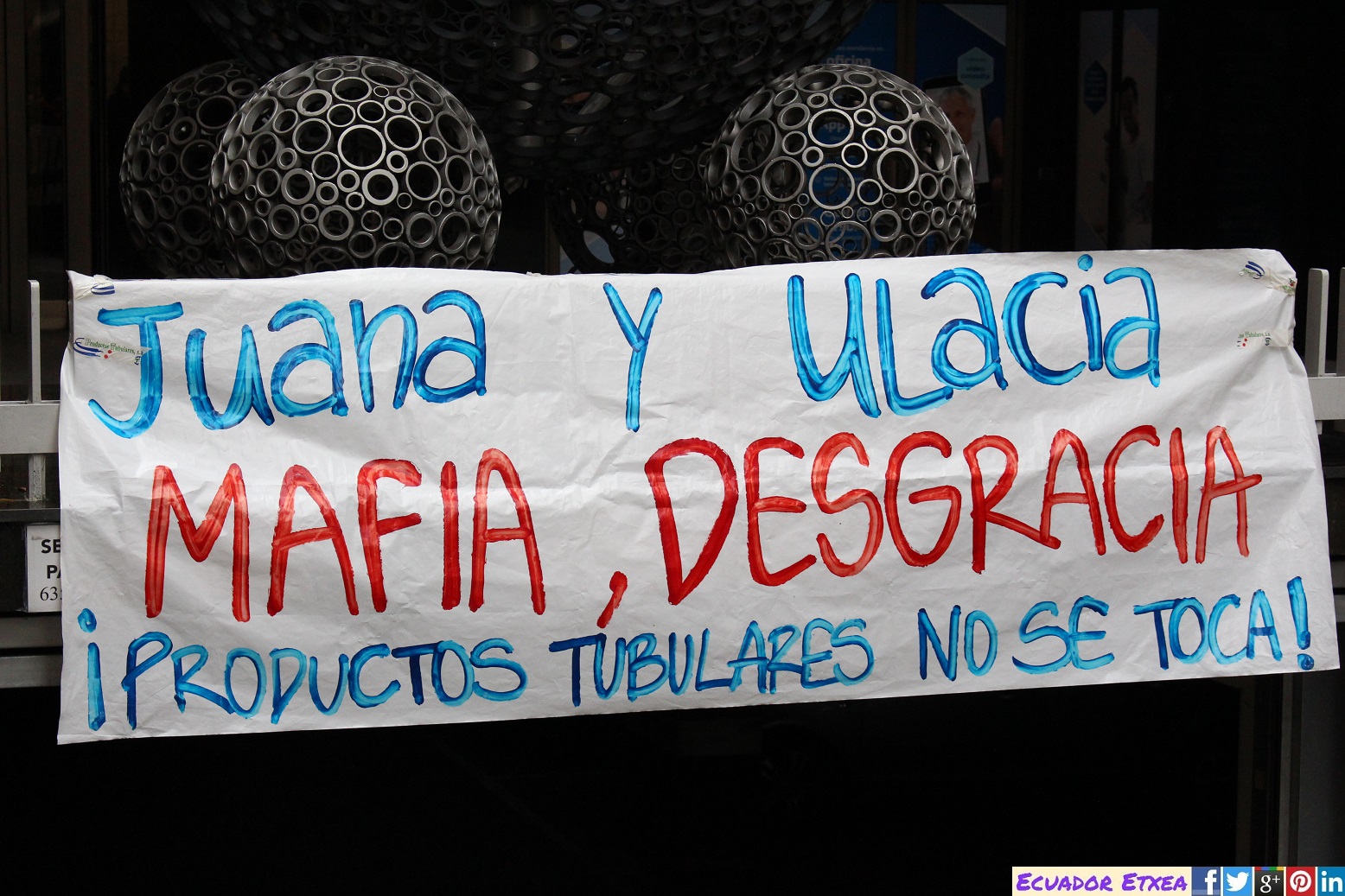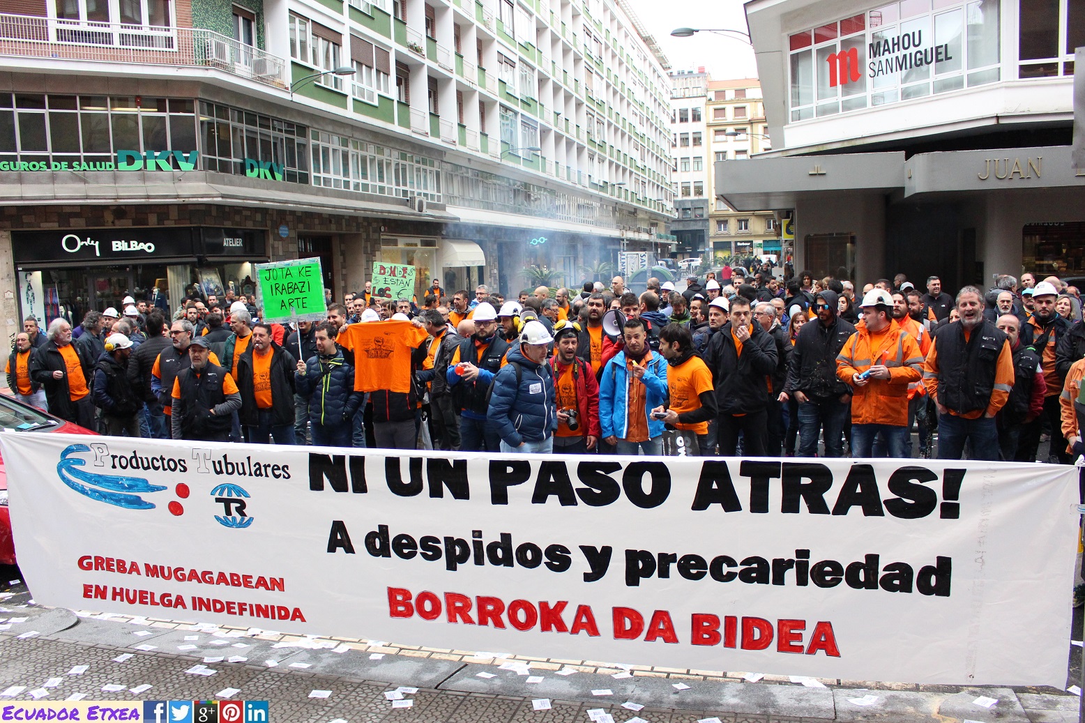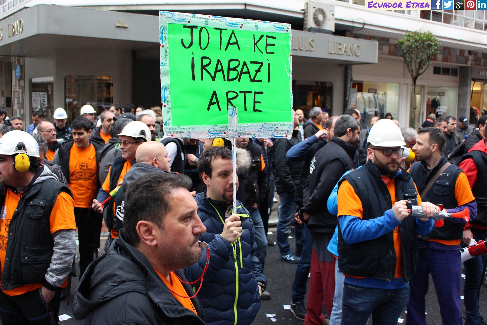 Este jueves 12 de abril ha tenido lugar una nueva jornada de protesta de los trabajadores de “Productos Tubulares” frente a la sede de “Tubos Reunidos” en Bilbao. En una semana en la que la dirección de la empresa ha manifestado su intención de despedir a 157 trabajadores exigiendo además más horas de trabajo con 25% menos de salario. Los trabajadores no se detendrán en su empeño y continuarán realizando movilizaciones con el apoyo de los sindicatos CCOO, UGT, ELA, LAB y ESK, para este viernes 13 de abril a las 9:00 una concentración frente al BBVA y Banco de España en la Gran Vía, 12 de Bilbao, y finalizarán esta semana de reivindicaciones con una manifestación que partirá este sábado 14 a las 12:00 desde la acería hasta el Ayuntamiento de Barakaldo.