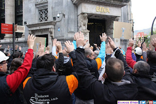 Hoy, los trabajadores de Productos Tubulares, quienes llevan en huelga indefinida desde hace más de un mes, se han plantado frente a la sede del BBVA en Bilbao, accionista mayoritario de la empresa, gritando consignas como “BBVA responsable”, “¿Dónde está el dinero?”, “Acería Ez itxi” para denunciar la intención de la dirección de la empresa de despedir a 157 trabajadores, bajarles un 25% los salarios, aumentarles las jornadas laborales y provocar el cierre de la acería. Las movilizaciones se continuarán realizando con el apoyo de los sindicatos CCOO, UGT, ELA, LAB y ESK, como la manifestación que partirá este sábado 14 a las 12:00 desde la acería hasta el Ayuntamiento de Barakaldo.