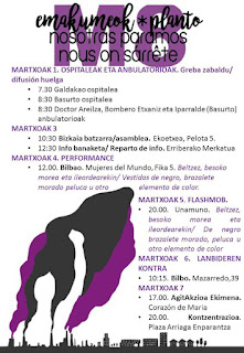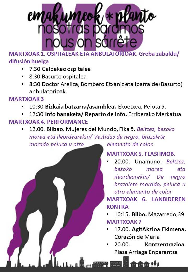 Este 8 de marzo, el movimiento feminista de Euskal Herria queremos unirnos al grito de NOSOTRAS PARAMOS, para denunciar este sistema capitalista, racista y heteropatriarcal que nos somete y aplasta. Este día será un punto de partida en un camino mucho más largo, en el que iremos tejiendo nuevas alianzas, encontrándonos y reconociéndonos, repensando nuestras luchas, construyendo nuevas resistencias, desconectándonos de un mundo que nos desecha, para generar una alternativa feminista.
