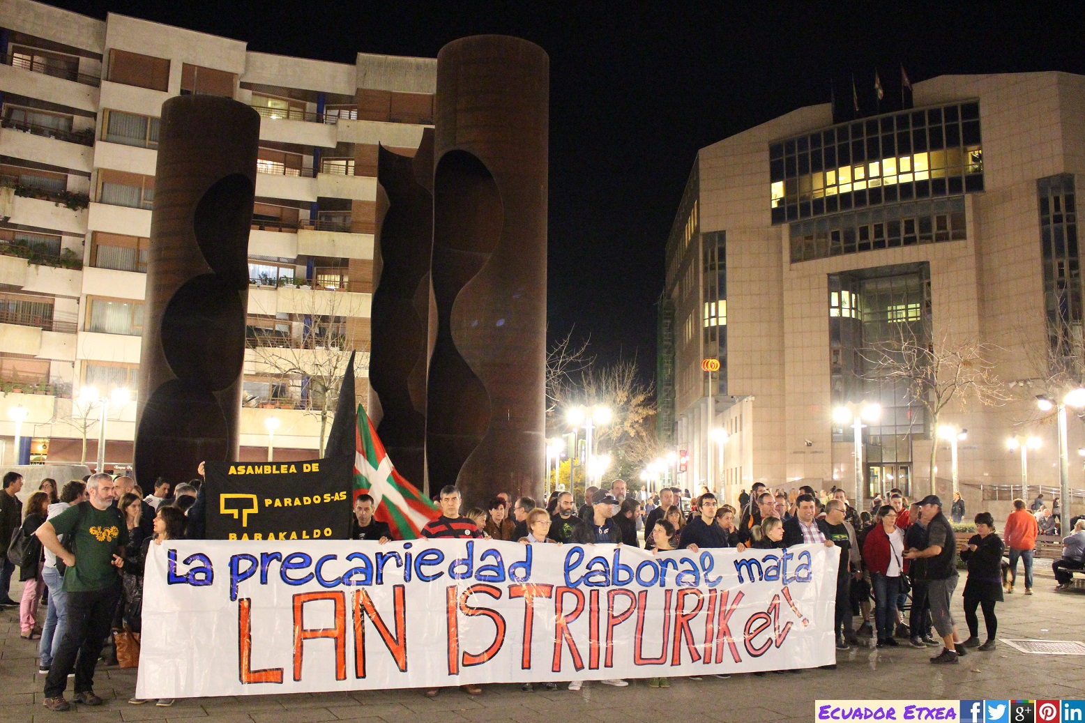 Decenas de personas se han concentrado la noche de este jueves 2 de noviembre en la Plaza Bide Onera de Barakaldo, convocadas por colectivos sociales y sindicales para denunciar la precariedad laboral que ha provocado el fallecimiento de un vecino y trabajador de la empresa Cementos Lemona al precipitarse desde una altura de 20 metros.
